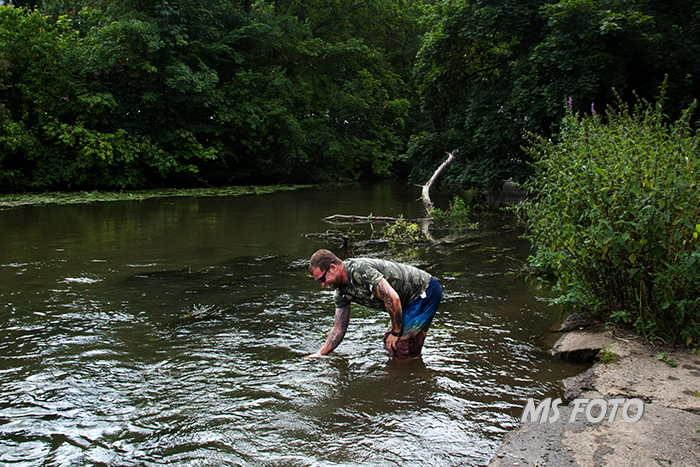 Karl Schwebel zeigt, wie man mit dem Sieb die Wasserpflanzen abstreift.