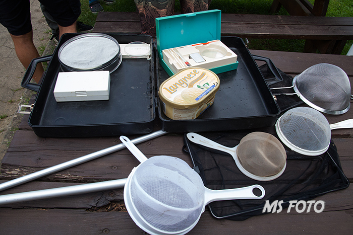 Küchensieb, ein Netz, ein Gefäß und eine Pinzette