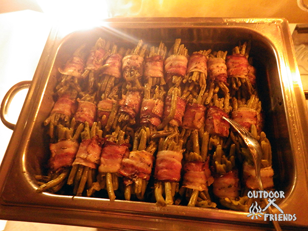 Draußen im Ofen sind schon die Kartoffeln im Schinkenmantel