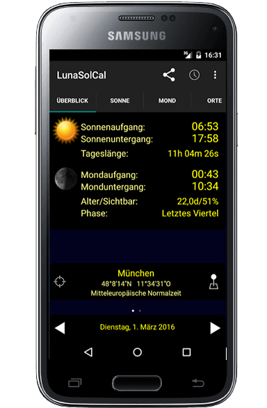Luna SolCal Grundlegende und auch für Nicht-Amateurastronomen verständliche Informationen über Sonnen- und Mondlauf, Auf- und Untergangszeiten, Dämmerungszeiten an Hand von GPS-Koordinaten oder einer Städteauswahl. Mit Anzeige der eigenen Koordinaten. kostenlos |